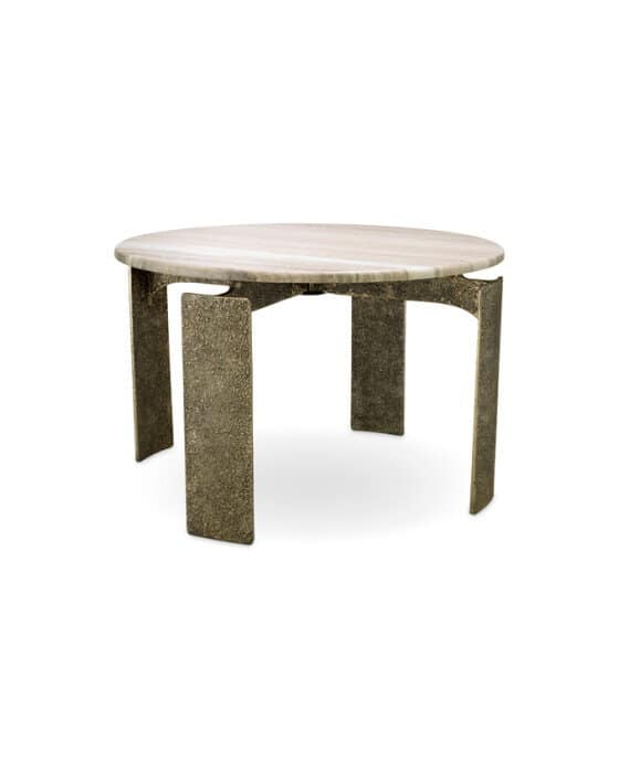 Bodega rundt spisebord fra Eichholtz kombinerer en skulpturel form med solidt håndværk og bliver et naturligt blikfang i dit hjem. Bordets base i håndstøbt metal med antik finish giver et varmt og karakterfuldt udtryk.Den glatte, polerede marmorskive skaber en fin kontrast og bidrager til en afbalanceret helhed, hvor et moderne udtryk møder tidløs design. Et indbydende spisebord, som løfter både hverdagsmåltider og sociale lejligheder.