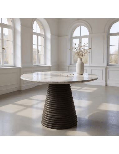 Rundt spisebord udført i et nordisk design af mørkebrun lakeret mangotræ og med bordplade i en smuk grå marmor. Spisebordet måler 76 cm i højden og 115 cm i diameter.